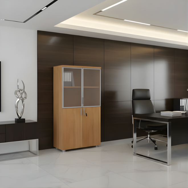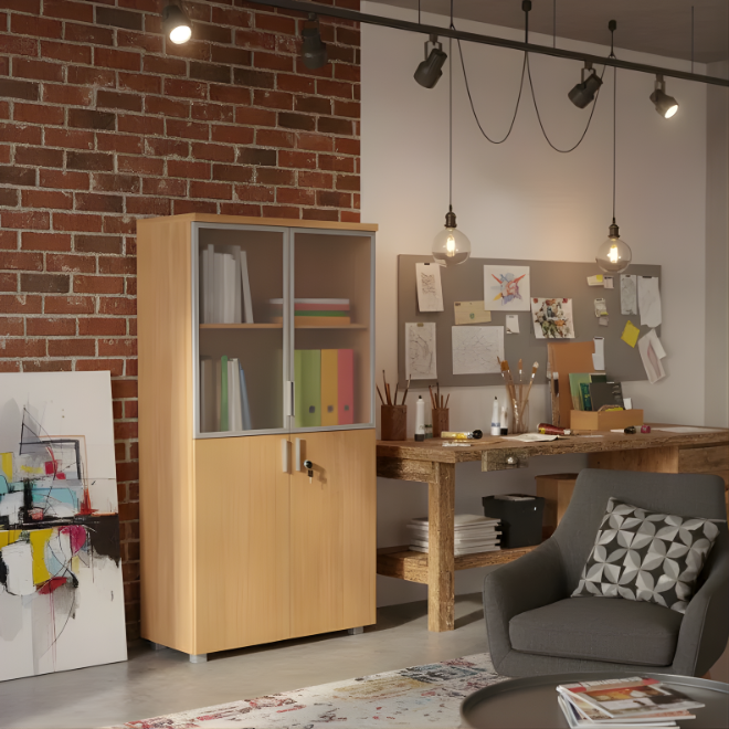 Double espace de rangement : partie vitrée supérieure + compartiment bas verrouillable.
