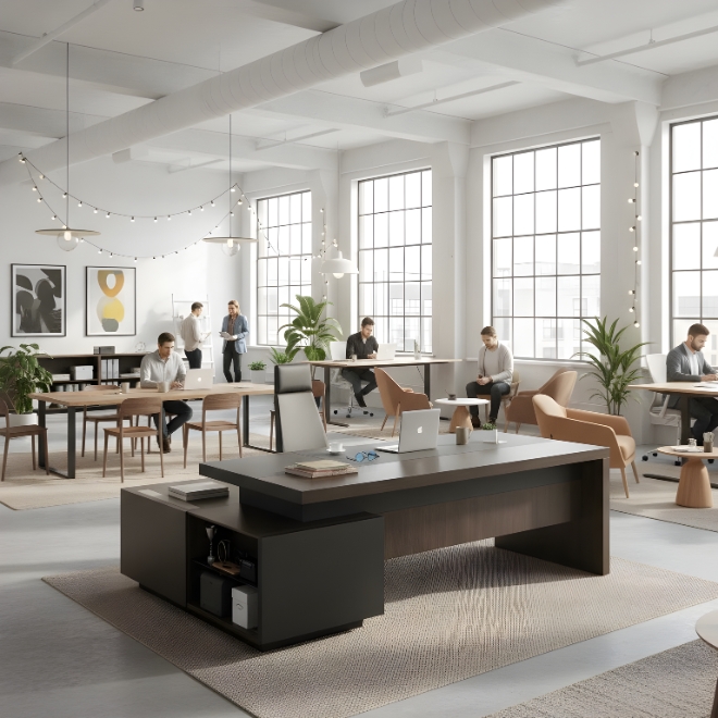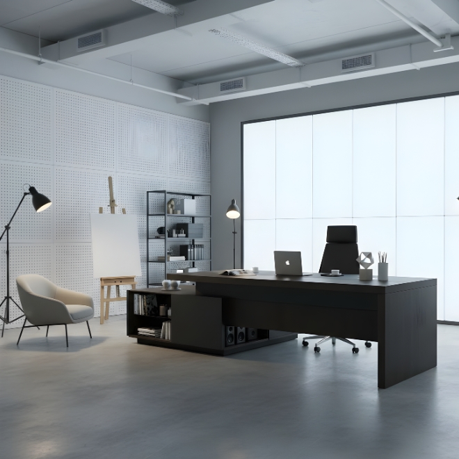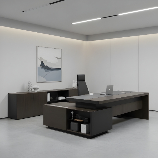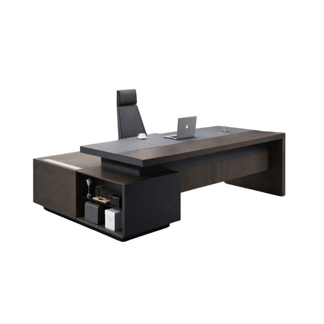- En bois mélaminé avec sous-main habillé cuir côté utilisateur