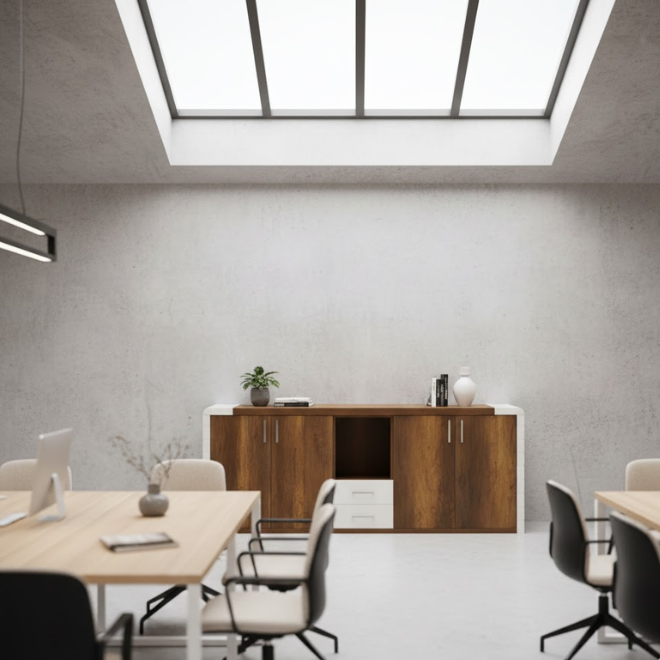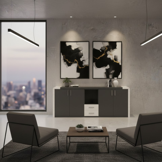 Meuble de retour fixe en MDF avec rangement fonctionnel.