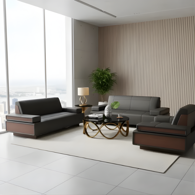 • Salon haut de gamme en véritable cuir, avec accoudoirs habillés de bois.