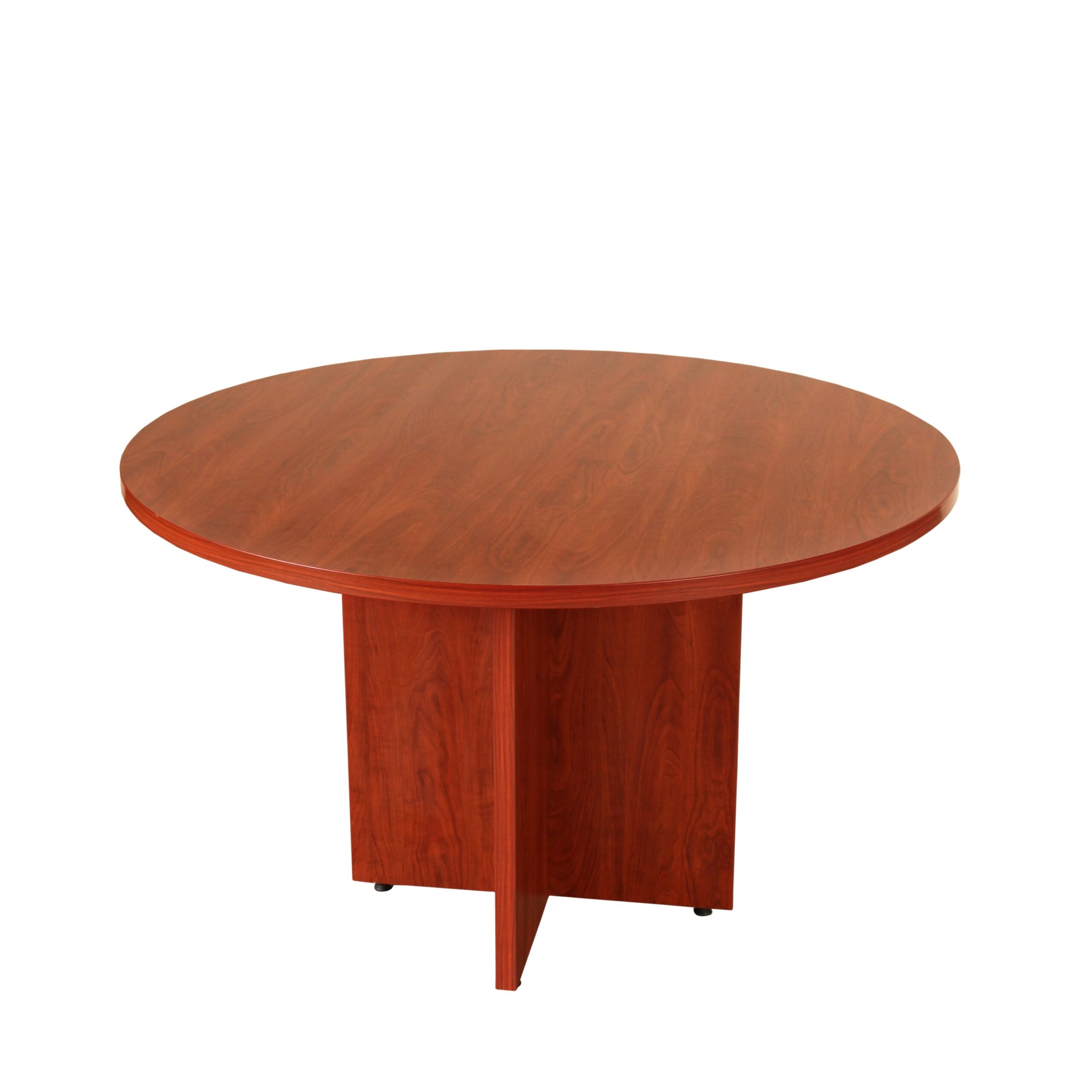 Table ronde élégante avec piètement en croix en bois stratifié.